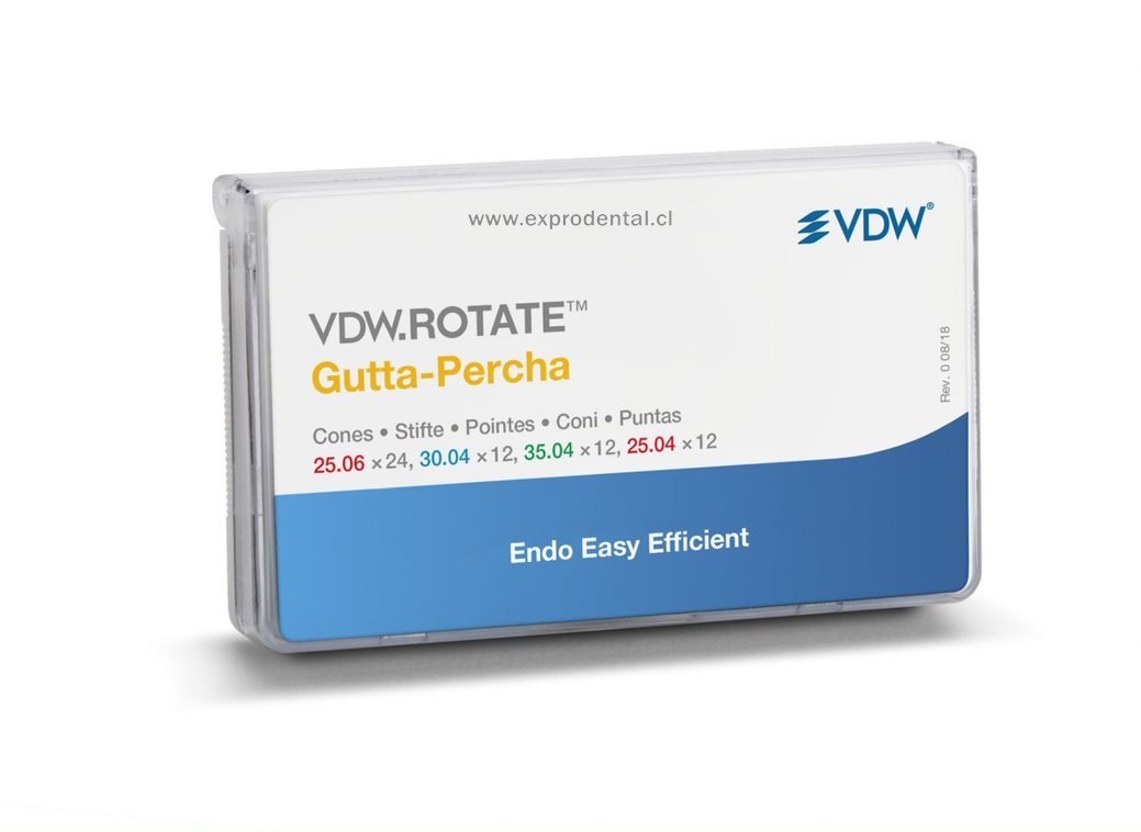 Puntas de guttapercha para sistema rotatorio VDW.ROTATE Gutta-Percha son utilizadas para obturación en frío y en caliente moldeado por inyección con ajuste preciso a los canales formados con los instrumentos adecuado para el sistema VDW.ROTATE NiTi contienen la caja de 60 unidades.